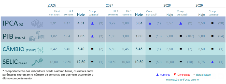 O Relatório Focus é divulgado toda segunda-feira pelo Banco Central do Brasil e reúne a mediana das projeções de cerca de 170 instituições financeiras para os principais indicadores da economia. As estimativas para o ano corrente e os três seguintes são comparadas semanalmente, permitindo acompanhar a evolução das expectativas do mercado.