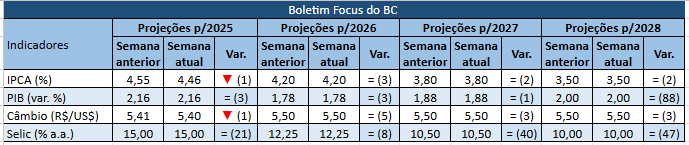 A projeção do Focus para a inflação (IPCA) de 2025 é de 4,46%, abaixo dos 4,55% da semana passada e inferior ao teto da meta. Já para 2026, 2027 e 2028 mantém-se em 4,20%, 3,80% e 3,50%, respectivamente.