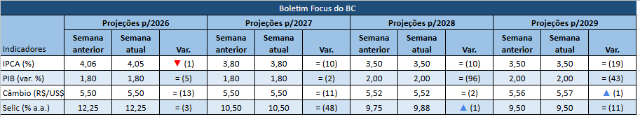 A projeção de inflação de 2026 caiu 0,01 ponto percentual na pesquisa feita pelo Banco Central e divulgada nesta segunda-feira (12/1) no Boletim Focus. A projeção deste ano desceu de 4,06% para 4,5%, mantendo-se estável em 3,80%, 3,50% e 3,50% para os anos de 2027, 2028 e 2029, respectivamente (ver quadro abaixo).