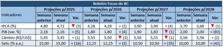 O Boletim Focus publicado nesta segunda-feira (13/10) pelo Banco Central mostra a projeção do IPCA deste ano em queda, descendo de 4,80% para 4,73%, e mantendo-se estável nos anos de 2026 e 2027, em 4,28%, 3,90%, respectivamente. Para 2028, a projeção da inflação também indica queda, de 3,70% para 3,68% (ver quadro abaixo).