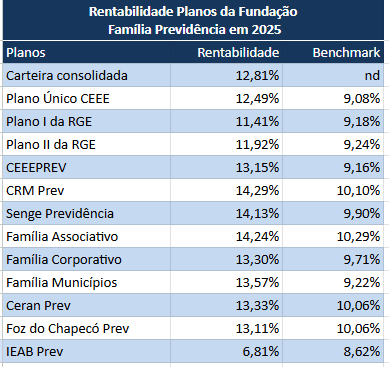 A Fundação Família Previdência encerrou 2025 com rentabilidade consolidada de 12,81%. A entidade não especifica qual o benchmark consolidado do mesmo período. O bom resultado de 2025 é atribuído às alocações em títulos públicos federais marcados na curva.