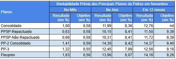 A Petros, fundo de pensão que tem a Petrobras como principal patrocinadora, encerrou o mês de novembro com sua carteira consolidada apresentando uma rentabilidade prévia de 1,00% no mês, de 11,99% no acumulado do ano e de 12,76% em 12 meses, contra objetivos de retorno de 0,58% no mês e de 8,36% no ano. O objetivo de retorno de 12 meses não foi divulgado (veja abaixo os resultados do consolidado e dos principais planos).