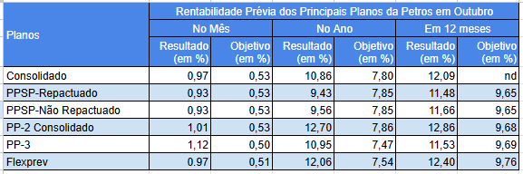 A Petros, fundo de pensão que tem a Petrobras como principal patrocinadora, encerrou o mês de outubro com sua carteira consolidada apresentando uma rentabilidade prévia de 0,97% no mês, de 10,86% no acumulado do ano e de 12,09% em 12 meses, contra objetivos de retorno de 0,53% no mês e de 7,80% no ano. O objetivo de retorno de 12 meses não foi divulgado (veja abaixo os resultados do consolidado e dos principais planos).