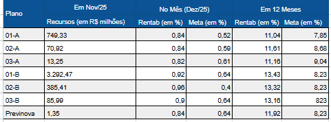 A Previnorte, fundo de pensão dos funcionários da Eletronorte e outras empresas do setor elétrico, divulgou a rentabilidade dos seus sete planos de benefícios em dezembro, cujo patrimônio consolidado atingiu R$ 4,60 bilhões no mês. O plano 01-B, o maior deles com patrimônio de R$ 3,29 bilhões, rendeu 0,92% no mês e 13,43% no acumulado dos 12 meses de 2025, para metas de 0,64% e 8,23%, respectivamente. Veja o desempenho dos planos no quadro abaixo: