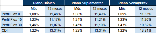 A PRhosper, fundo de pensão dos funcionários do grupo Rhodia, divulgou a rentabilidade de setembro dos seus três planos: Básico, Suplementar e SolvayPrev. Os três possuem perfis de investimento semelhantes, sendo que o perfil Flex 0 não tem renda variável, o Flex 15 tem 15% de RV e o Flex 30 tem 30% de RV. Veja abaixo as rentabilidades do mês e do acumulado de 12 meses até setembro.