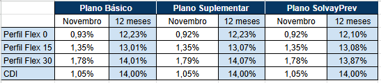 A PRhosper, fundo de pensão dos funcionários do grupo Rhodia, divulgou a rentabilidade de novembro dos seus três planos: Básico, Suplementar e SolvayPrev. Os três possuem perfis de investimento semelhantes, sendo que o perfil Flex 0 não tem renda variável, o Flex 15 tem 15% de RV e o Flex 30 tem 30% de RV. Veja abaixo as rentabilidades do mês e do acumulado de 12 meses até novembro.
