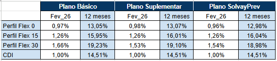 A PRhosper, fundo de pensão dos funcionários do grupo Rhodia, divulgou a rentabilidade de fevereiro de 2026 de seus três planos: Básico, Suplementar e SolvayPrev. Os três possuem perfis de investimento semelhantes, sendo que o perfil Flex 0 não tem renda variável, o Flex 15 tem 15% de RV e o Flex 30 tem 30% de RV. Veja abaixo as rentabilidades do mês e do acumulado de 12 meses até fevereiro.