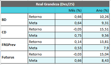 A Real Grandeza, fundo de pensão patrocinada por Axia (antiga Eletrobras) e Eletronuclear, divulgou seus resultados de 2025. No ano, a rentabilidade dos quatro planos da entidade ficou acima das suas referências atuariais, mas no último mês do ano apenas o BD conseguiu bater a meta.