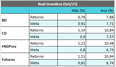A Real Grandeza, fundo de pensão patrocinada por Eletrobras e Eletronuclear, divulgou seus resultados de setembro.  No mês, a entidade superou as metas em três de seus quatro planos, perdendo dessa referência apenas no plano BD. No ano, todos os quatro planos superaram a meta (ver quadro abaixo).