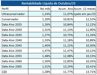 A Vexty, fundo de pensão que abriga empresas do antigo grupo Odebrecht e outras, divulgou a rentabilidade de outubro do seu plano de Contribuição Definida (CD). Com pouco mais de R$ 5 bilhões em patrimônio, a Vexty mantém 11 perfis de investimento em seu plano CD. No mês, a melhor rentabilidade foi a do perfil data-alvo 2065, que alcançou 1,51%, e a pior foi a do perfil conservador, que ficou em 1,20%. Já no acumulado de 12 meses, o melhor retorno foi o do perfil conservador, com 12,52%, e o pior foi o do perfil data-alvo 2050, com 10,12%. Veja abaixo a rentabilidade de cada um dos perfis: