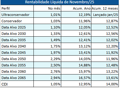 A Vexty, fundo de pensão que abriga empresas do antigo grupo Odebrecht e outras, divulgou a rentabilidade de novembro do seu plano de Contribuição Definida (CD). Com pouco mais de R$ 5 bilhões em patrimônio, a Vexty mantém 11 perfis de investimento em seu plano CD. No mês, a melhor rentabilidade foi a do perfil data-alvo 2065, que alcançou 2,94%, e a pior foi a do perfil ultraconservador, que ficou em 1,01%. Já no acumulado de 12 meses, o melhor retorno foi também a do perfil data-alvo 2065, com 13,61%, e o pior foi o do perfil data-alvo 2045, com 11,92%. Veja abaixo a rentabilidade de cada um dos perfis:
