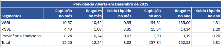 A previdência aberta — que inclui os planos VGBL (Vida Gerador de Benefício Livre), PGBL (Plano Gerador de Benefício Livre) e os tradicionais — encerrou 2025 com captação líquida positiva de R$ 5,31 bilhões. O resultado decorre de R$ 157,84 bilhões em aportes e R$ 152,53 bilhões em resgates, segundo dados da Superintendência de Seguros Privados (Susep).