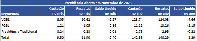 Os planos de previdência privada aberta fecharam o mês de novembro com um saldo líquido negativo de R$ -2,40 bilhões, com captações de R$ 10,50 bilhões e resgates de R$ 13,54 bilhões, segundo dados da Superintendência de Seguros Privados (Susep). É o quarto mês consecutivo e o quinto no ano que a previdência aberta, que inclui os planos VGBL, PGBL e tradicionais, fecha no vermelho.