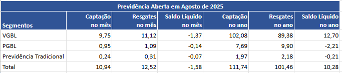 Os planos de previdência privada aberta tiveram um saldo líquido negativo de R$ 1,58 bilhões em agosto, com captações de R$ 10,94 bilhões e resgates de R$ 12,52 bilhões no período, segundo dados da Superintendência de Seguros Privados (Susep). No acumulado do ano, até agosto, o saldo líquido é positivo em R$ 10,28 bilhões, resultado de captações de R$ 111,74 bilhões e resgates de R$ 101,46 bilhões (ver quadro abaixo).