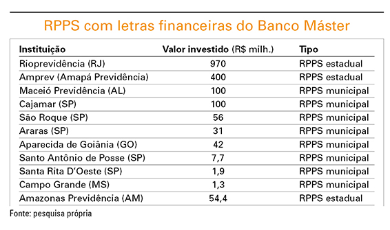Um total de onze regimes próprios compraram esses títulos, somando pouco mais de R$ 1,76 bilhão. O maior investidor do banco foi o Rioprevidência, instituto dos servidores do Rio de Janeiro, com R$ 970 milhões aplicados, seguido dos institutos dos servidores do Amapá, de Maceió (AL) e de Cajamar (SP), com respectivamente R$ 400 milhões, R$ 100 milhões e R$ 100 milhões aplicados (ver quadro).