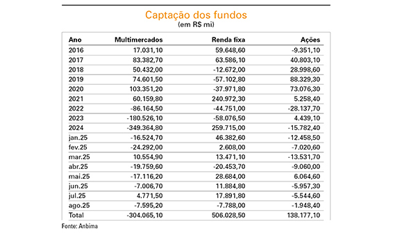 Com dificuldades para entregar retornos consistentes acima do CDI, a última vez em que a categoria conseguiu fechar o ano com captação líquida positiva foi em 2021, quando teve entradas de R$ 60,2 bilhões. Entre 2022 e 2024, foram cerca de R$ 616 bilhões em resgates, com 2025 caminhando para manter a toada. De janeiro a agosto deste ano os investidores sacaram mais R$ 77 bilhões dos multimercados, segundo dados da Associação Brasileira das Entidades dos Mercados Financeiro e de Capitais (Anbima). No mesmo período, os fundos de ações perderam R$ 89 bilhões e os fundos de renda fixa captaram R$ 250 bilhões.