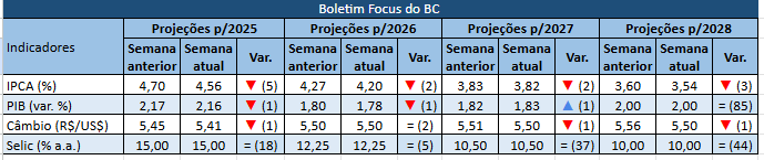 Em relação ao câmbio, o boletim projeta o dólar fechando este ano em queda, a R$ 5,41, e o ano que vem em estabilidade, a R$ 5,50. Já para 2027 e 2028 a projeção para a moeda norte-americana é de baixa, fechando em R$ 5,50 nos dois anos.