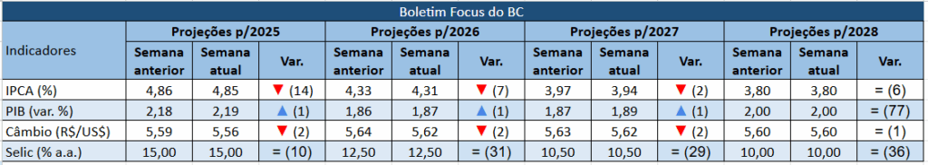 E a Selic mantém-se estável nos quatro anos pesquisados, com projeção de fechar este ano em 15,00% (estável pela 10º semana consecutiva), o ano de 2026 em 12,50% (estável pela 31ª semana consecutiva), o ano de 2027 em 10,50% (estável pela 29ª semana consecutiva) e o ano de 2028 em 10% (estável pela 36º semana consecutiva).